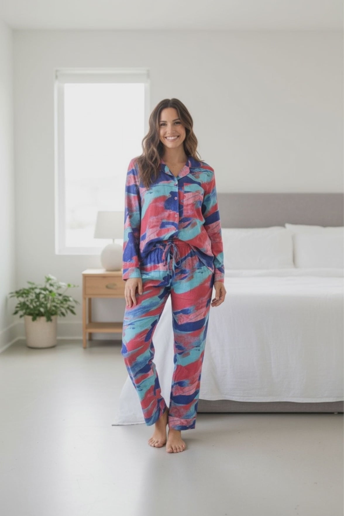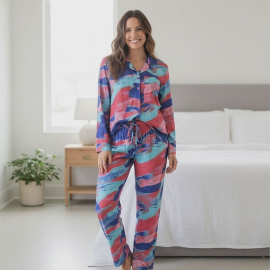 Pijama Americano Longo, Tecido Estampado Colorido Tipo Seda (Poliéster com Elastano)